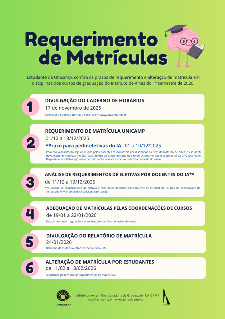 Nos períodos de Matrícula e Alteração de Matrícula é possível o estudante realizar pedidos de Opção Curricular no sistema e-DAC e alunos formados na Unicamp podem solicitar Reingresso, conforme orientações no site do IA em Formas de Ingresso.