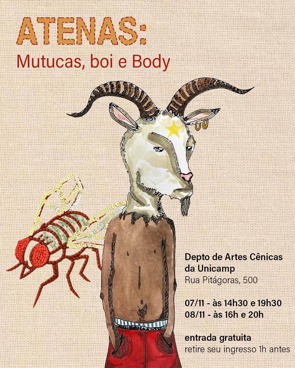 SINOPSE : Em ATENAS: Mutucas, boi e Body, o Coro de Mutucas convoca a comunidade para a vigília do pagamento da promessa: passaram a mão no capado engordado para alimentar a festa; então, a busca pelo culpado e o medo de não pagar a promessa espalham suspeitas “de dentro e de fora”, reacendendo memórias ruins e atiçando a pressão para pagar a conta.