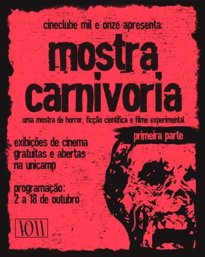 A Mostra Carnivoria acontece de 2 a 30 de outubro na Unicamp, organizada pelo Cineclube 1011, com apoio institucional da ProEEC, DCult, Instituto de Artes e Extensão, Espaço Cultural Casa do Lago, Sistema de Bibliotecas da Unicamp e BIBCOM, e em parceria com Versátil Home Video e Ideia Cultural.